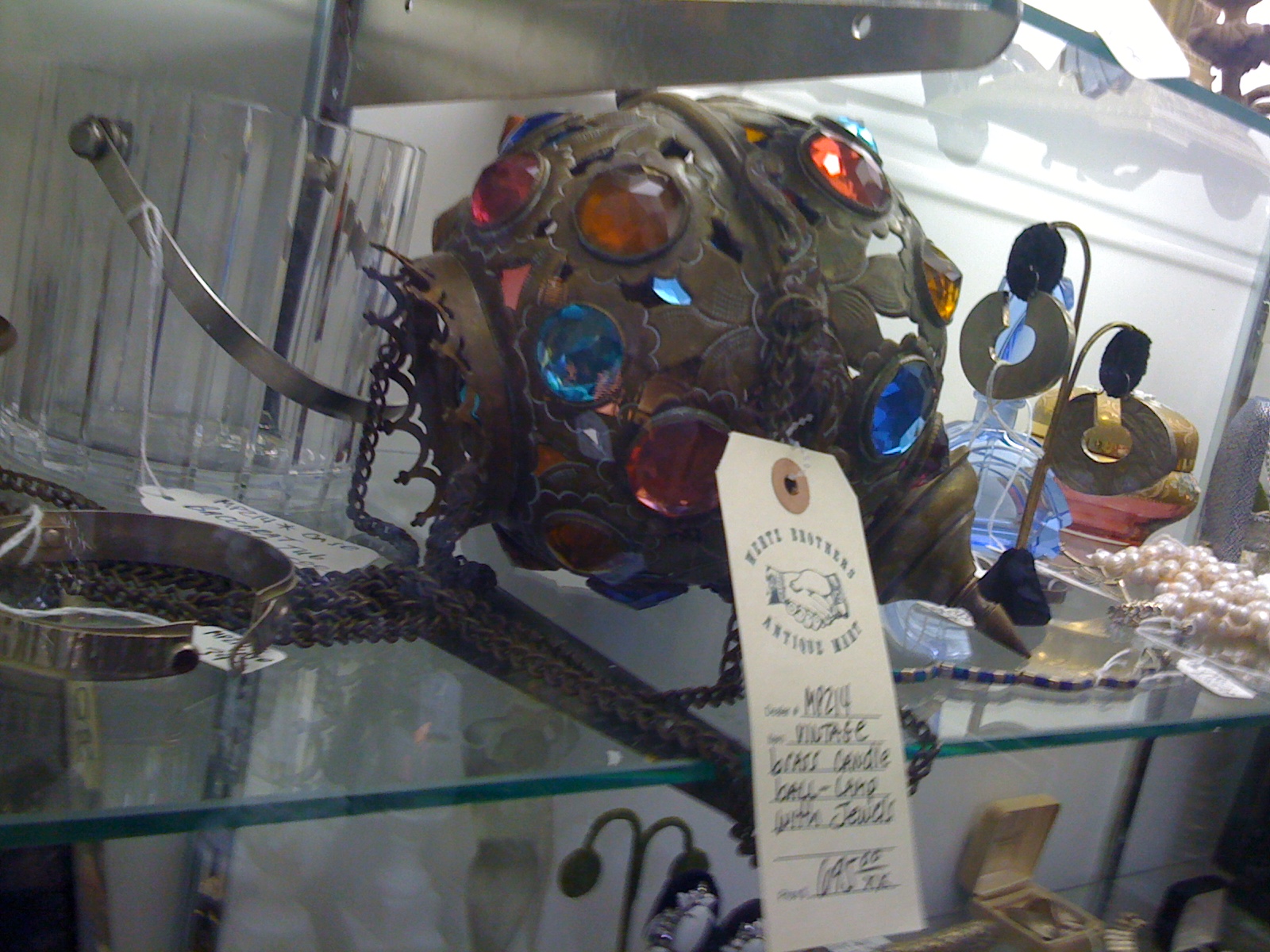 Brass jeweled lantern, would look great hung low in a dim, red-walled or exoticly wallpapered powder: